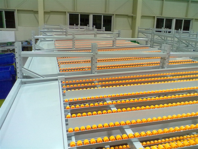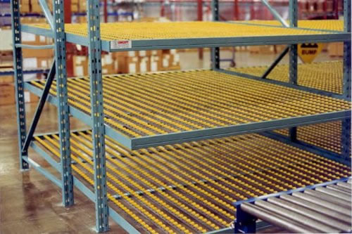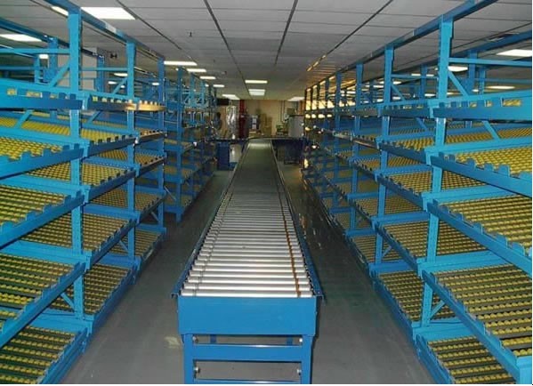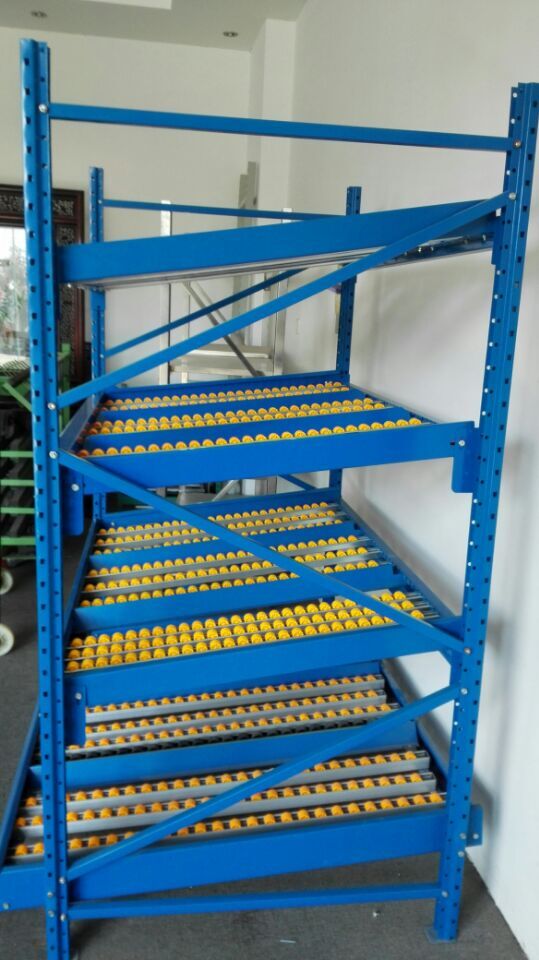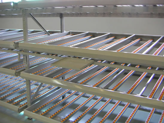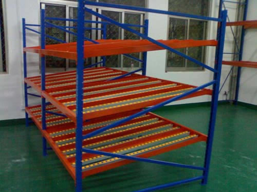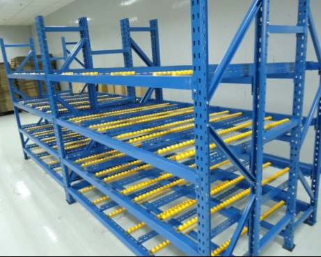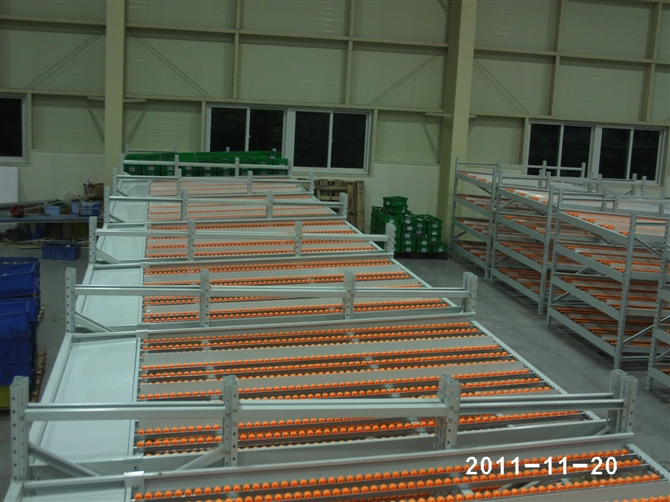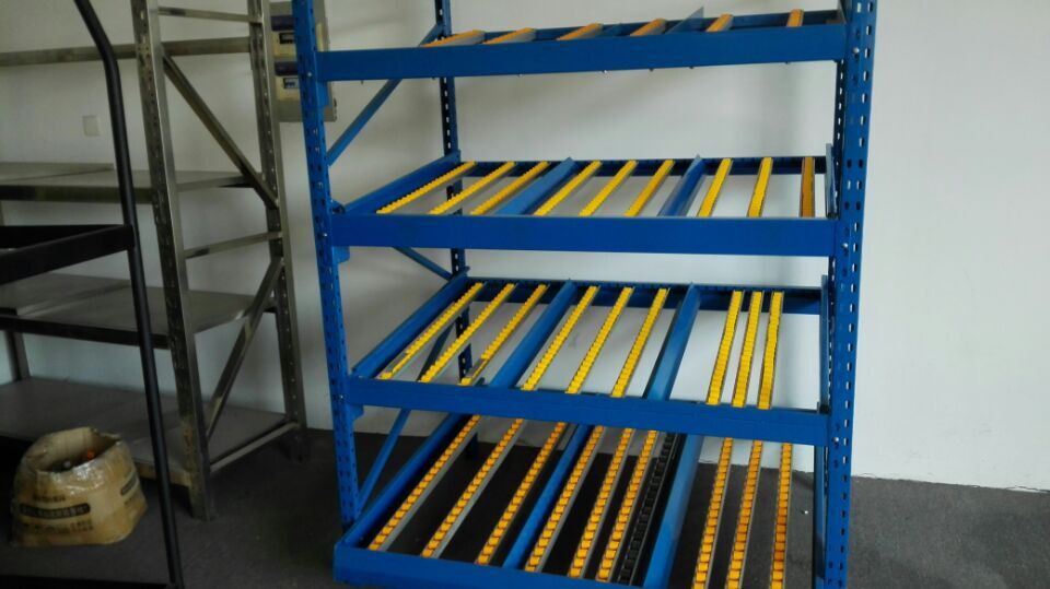 流利货架等同于流利式货架,产品常由中型横梁式货架演变而成,通过滚道将货物从配货端输送到取货端,货物借助重力自动下滑,可实现“先进先出”作业,使用成本低,存储速度快、密度大。通常使用在企业的精益生产流水作业。 流利货架的特点: 1、采用滚轮式铝合金等流力条,利用货物自重实现货的先进先出。 2、存取方便,适合于装配线两侧,配送中心等场所。 3、适用于大批量同类货物的存储,空间利用率较高,由其适合汽配工厂使用。 4、可配以电子标签,实现货物的信息化管理。